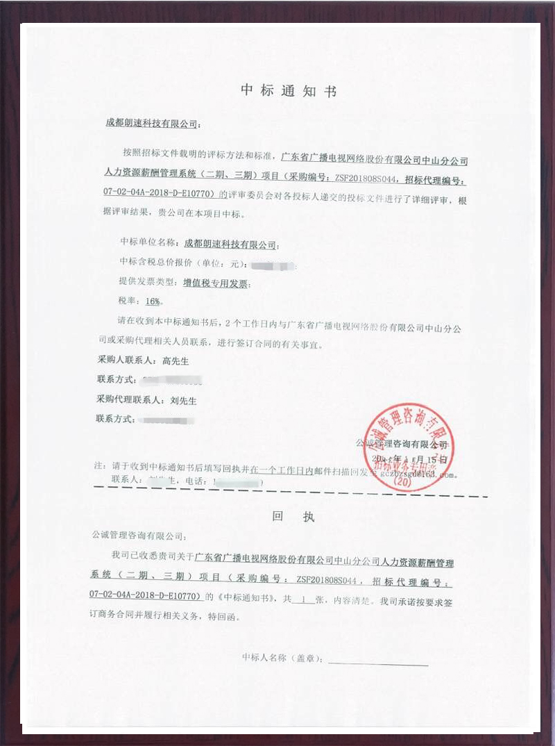 祝賀:朗速軟件中標廣東省廣播電視網絡中山分公司《人力資源薪酬管理系統》,廣東省廣播電視網絡股份有限公司(簡稱:廣東廣電網絡)是經廣東省委、省政府批準,由20家發起人共同發起組建的省屬大型國有文化企業,是以廣播電視節目傳輸為主業的大型現代化有線廣電網絡運營商。公司目前下轄珠江數碼集團有限公司、廣東有線廣播電視網絡股份有限公司(直屬公司)、19個地市分公司和68個縣級分公司,現有在職人員9100多人(含派 遣制人員)。用戶規模達1300多萬戶,總資產規模達150多億元。用戶規模、資產總額均位居全國同行業前茅。公司下一步還將全面推進全省廣電網絡資源整合,實現"全省一張網"的戰略目標,成為資產和經營收入超過200億元,有線電視用戶達到1900萬戶,在全國具有強大競爭力和影響力的知名骨干文化企業。2012年5月18日,入選第四屆中國“文化企業30強”